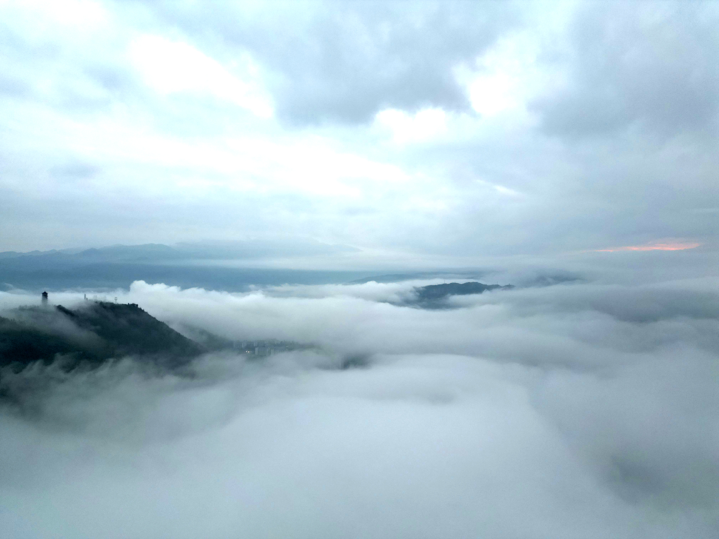 当日清晨,在巫峡以及县城上空,只见连绵不断的山脉在翻涌的云海中若隐若现,如同一幅幅流动的水墨画卷。登高鸟瞰,更蔚为壮观。洁白的云雾,时而风起云涌,波涛滚滚。时而奔涌如潮,浩浩荡荡。时而流淌在楼宇间,城市高楼若隐若现,宛如仙境。