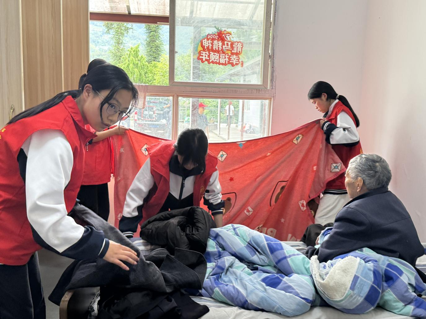 活动当日,尖山镇政府工作人员与天宝初级中学师生一同前往敬老院,送上慰问品与问候。学生们迅速分组行动,有的打扫房间、收拾床铺,用行动表达敬意;有的陪老人聊天,听其讲述过往。此外,学生们还带来舞蹈表演,用青春活力为老人带来欢乐。