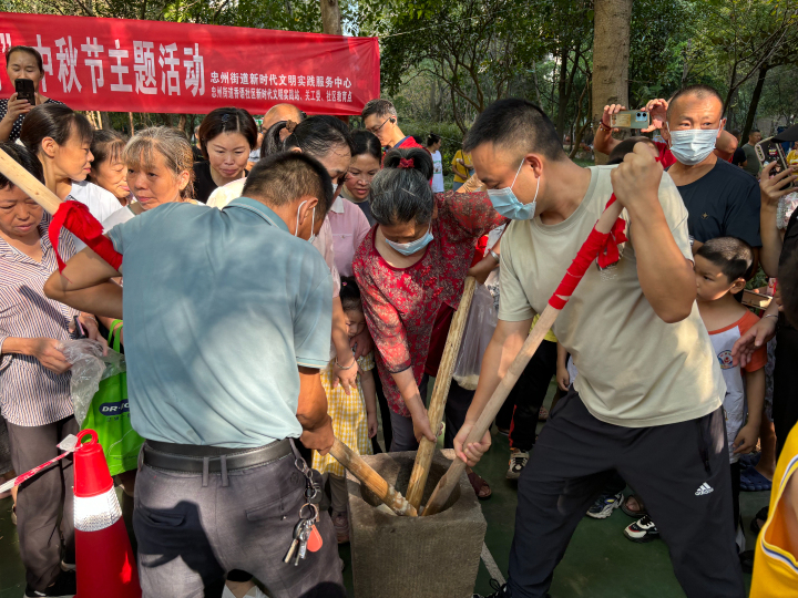 活动中,忠州街道党工委、办事处相关干部,新桥社区干部,以及社区专职网格员、居民小组长、居民代表齐聚一堂,开展打糍粑比赛,迎接中秋佳节的到来。