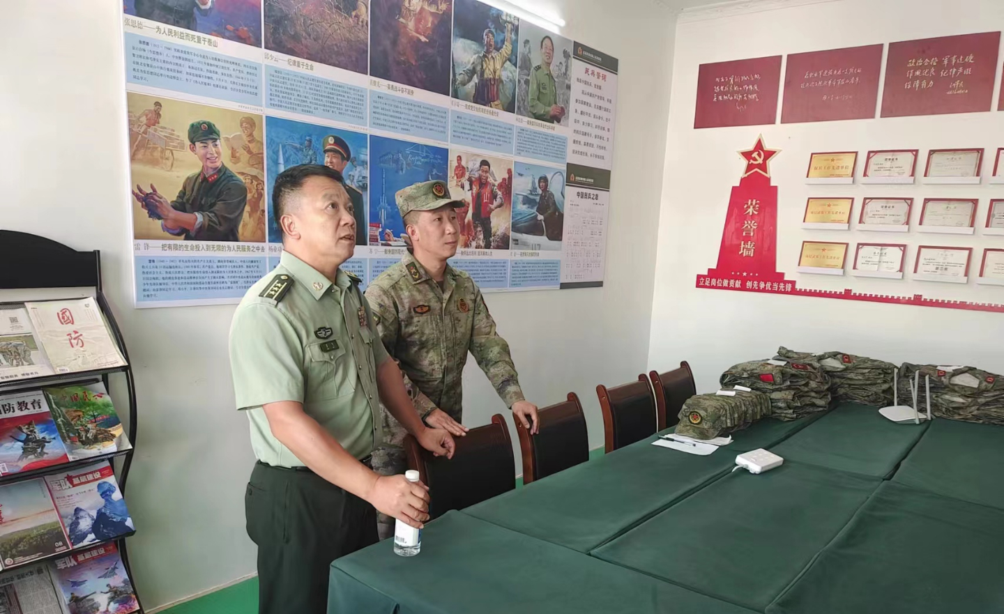 ▲肖飞检查指导镇武装部民兵活动室建设情况