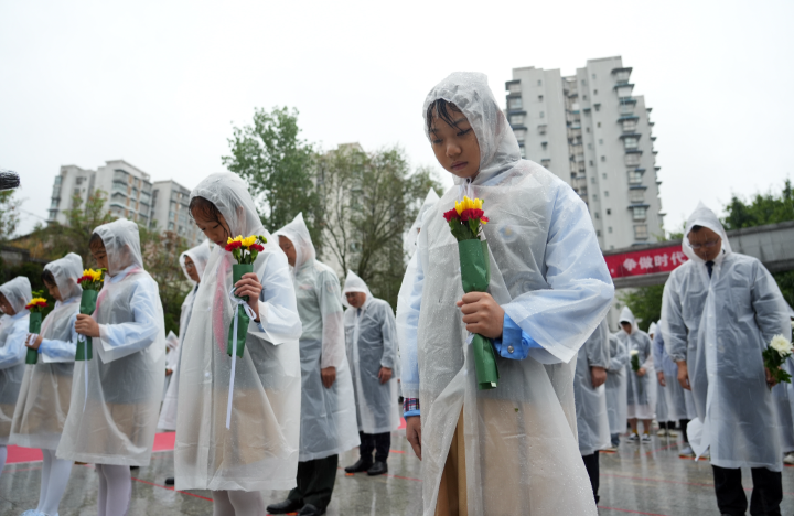 9月30日,梁平烈士陵园,少先队员手持鲜花为革命英烈默哀。(记者 向成国 摄)