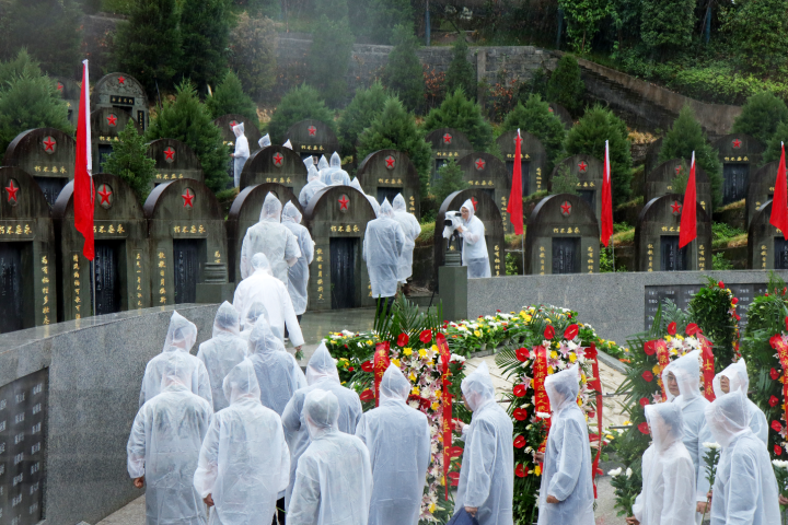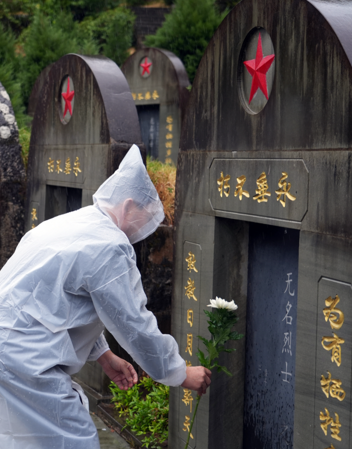 9月30日,天空飘着细雨,在梁平烈士陵园内,市民冒雨向无名烈士献花。(记者 向成国 摄)