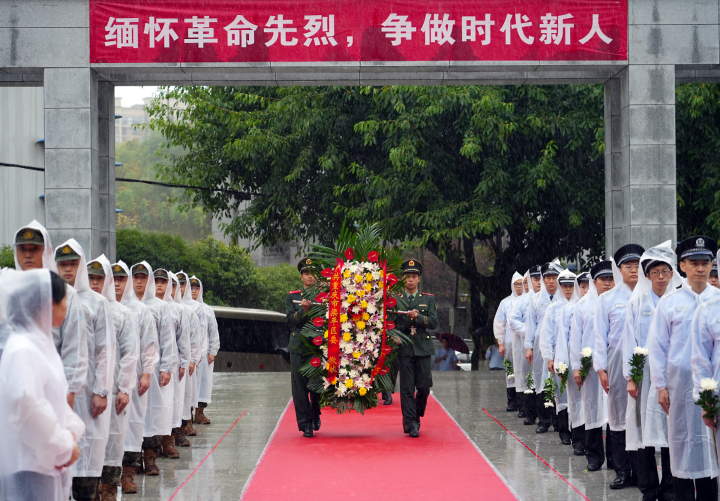 9月30日,梁平烈士陵园,武警仪仗队手抬花篮,迈着庄严的正步,向革命英烈敬献花篮。(记者 向成国 摄)