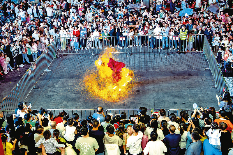 火树银花不夜天,流光溢彩映华年。国庆假期,国家级非遗民间绝技——火壶表演在新世纪商圈精彩上演,为市民和游客带来一场无与伦比的视觉盛宴。