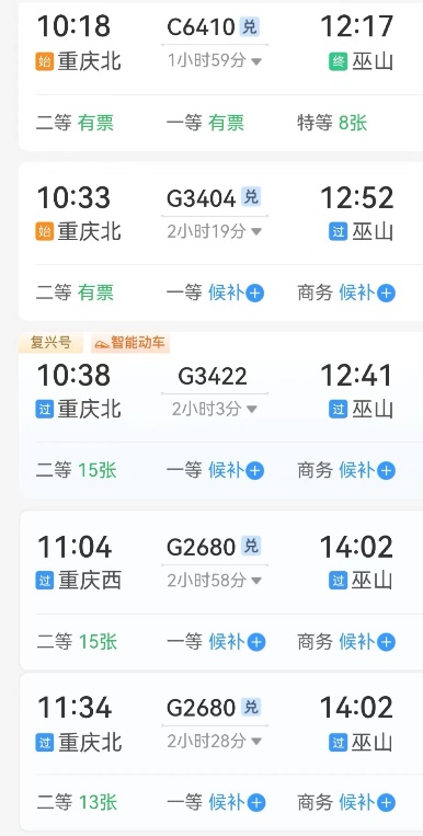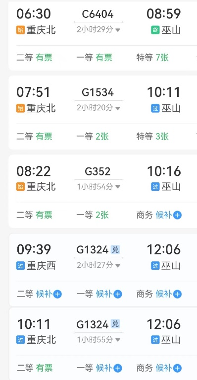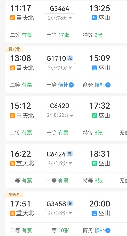 巫山高铁站于2022年6月投入运营,目前,从北京、上海、重庆、成都、武汉、贵阳、烟台方向均有直达本站的列车。巫山与重庆市区之间的距离大约为430公里,每天都有超过15班次的高铁列车从重庆北站出发经停巫山站,行驶时间约为2—2.5小时,如果您所在的城市没有直达巫山的高铁,从重庆北站中转也是不错的选择。
