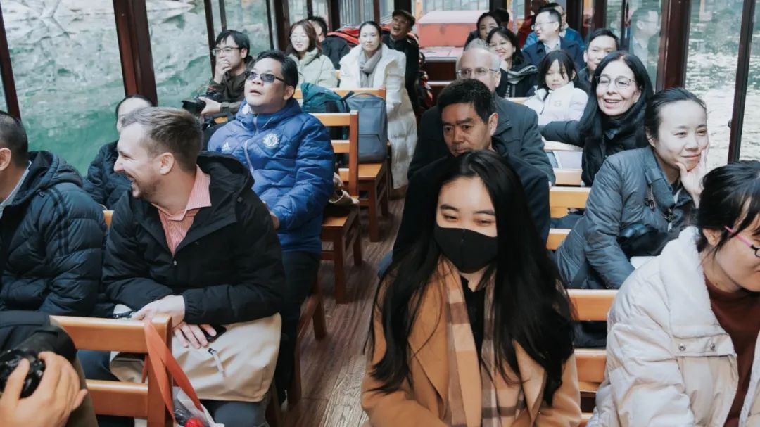 初冬的巫峡天空湛湛,江水悠悠。中外嘉宾乘坐“世纪凯哥”号游轮顺江而下,尽览高峡平湖的壮丽美景。从开阔的长江进入幽深的神女溪,嘉宾们换乘画舫船,踏上一趟“人在画中,画在景中,美在心中,心在乐中”的神奇之旅。大家纷纷走出船舱,拍照留恋。