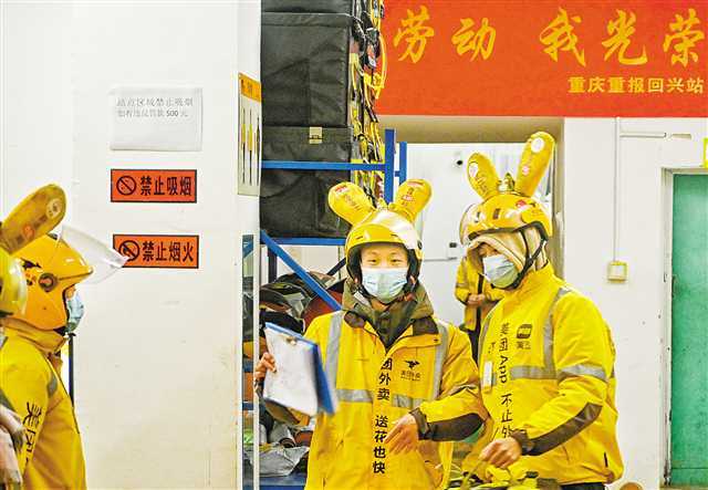 一月六日,渝北区重报回兴发行站,配送队员们整装待发准备开始一天的忙碌。给美团电商平台送餐,是重报发行物流板块的另一笔业务。记者 万难 摄视觉重庆