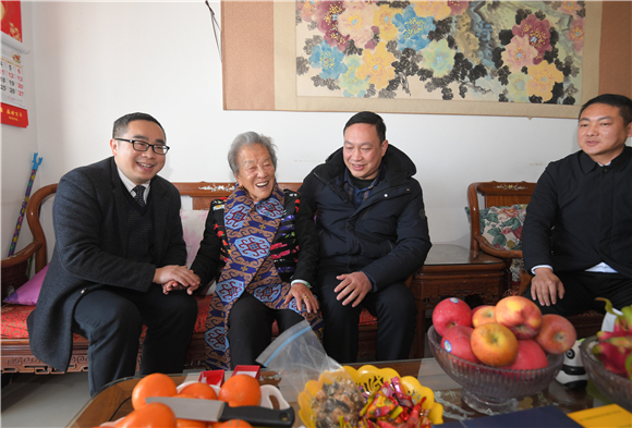 在王昌群老人家中,慰问组一行围坐在她身边,向她介绍了老家的经济社会发展情况,并送上来自家乡的土家织锦、围巾、茶叶、核桃油,仔细询问老人的日常生活和健康状况,希望她保重身体。
