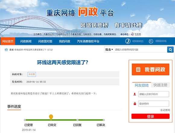 有群众在重庆网络问政平台上留言,询问轨道环线降速运行情况。网络截图