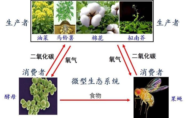 在这6种生物中,植物生产氧气和食物,供所有生物“消费”;作为消费者的果蝇和分解者的酵母,通过消耗氧气产生二氧化碳,供植物进行光合作用。此外,酵母可以分解植物和果蝇废弃物而生长,酵母又可以作为果蝇的食物。
