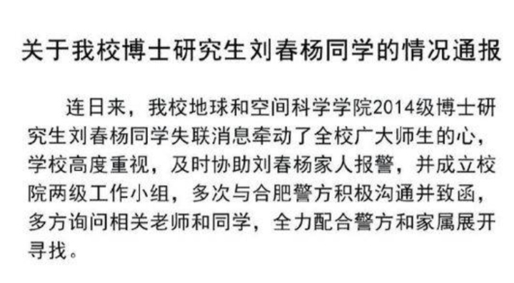 中国科学技术大学官方微博2月14日发布《关于我校博士研究生刘春杨同学的情况通报》,表示沉痛哀悼和万分惋惜。