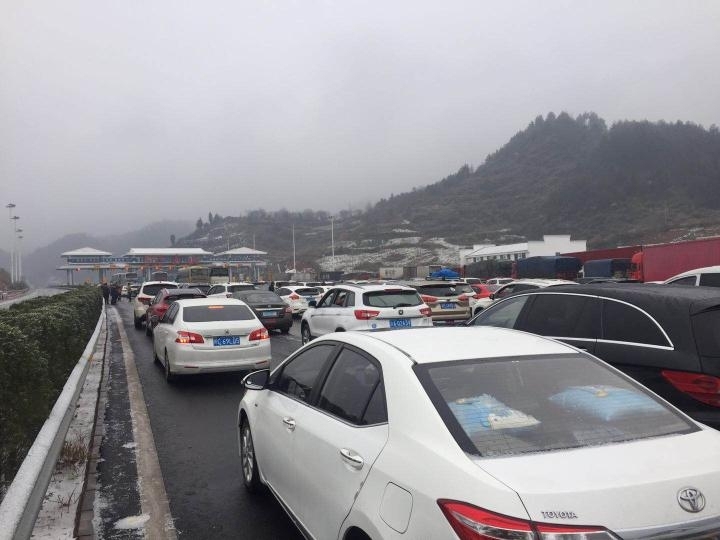 执法队员介绍,昨晚渝东南地区高速公路,尤其是与湖南、贵州相接的渝湘高速、秀松高速迎来降雪,大量车辆被积压在渝湘高速洪安省际收费站、秀松高速秀山南服务区及秀山省际收费站。重庆高速执法部门现正全力维护积压车辆秩序,但受邻省高速交通管制影响,目前经G65渝湘高速往湖南方向不能通行、经秀松高速往贵州松桃实行间断放行。