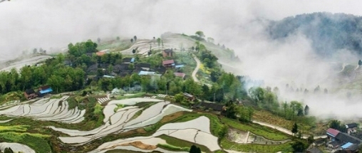 雨过天晴之后,黄金镇甘田、云丰等地的层层梯田春雾缭绕,村庄与梯田在雾中若隐若现,好似大师笔下的水墨画,如诗如画、宛若仙境。