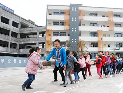课余时间,教师唐大鹏和孩子们玩起了老鹰捉小鸡的游戏。首席记者 李文科 摄
