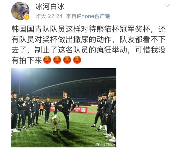 昨晚赛后,据前方摄影师@冰河白冰透露,韩国队在庆祝夺冠时候,对奖杯做出侮辱性动作:韩国国青队队员这样对待熊猫杯冠军奖杯,还有队员对奖杯做出撒尿的动作,队友都看不下去了,制止了这名队员的疯狂举动,可惜我没有拍下来。有球迷评论称,太丢人,一点职业道德都没有,不能忍!