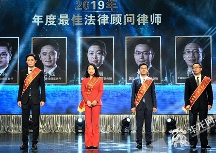 作为重庆市律师协会2019年度最佳法律顾问律师,王丽丽(中)站在台上等待领奖。记者 张勇 摄