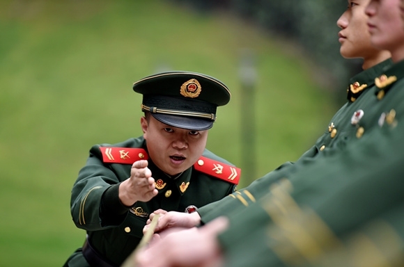 武警重庆总队执勤第二支队士官长封宇恒(左一)在队列训练中纠正战士动作。 通讯员 曹峰 摄