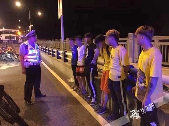 7月31日晚10点,巴南区交巡警支队勤务一大队民警杨勇和几名同事已经在路面设好点,观察整个路面情况。“这些娃儿凶得很!知道我们不敢穷追猛打,怕他们受伤,就有恃无恐。有的对你竖中指,有的还提起龙头(车头)从你头上飞过去。”杨勇说。