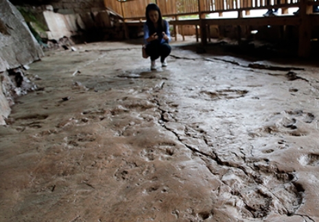 綦江国家地质公园,老瀛山风光如画,云雾缭绕,拾级而上,半山腰处,仅一人多高的岩缝中,光滑的石板上,神秘的足印清晰可见,或凹陷、或凸起,有大有小,令人不禁遥想远古时代,大群恐龙悠然自得生活在这儿的图景。据悉,这里的恐龙脚印数量达到650多个,化石产出层位之多、数量之大,分布之集中、保存类型之齐全、生物多样性之丰富,为国内外所罕见。