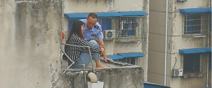 现场的情况让民警也紧张得直冒冷汗。只见女子坐在九楼楼顶外侧的露台上,双腿悬空荡在外面,离地面约三十米。女子情绪激动,稍有不慎,就可能发生意外。而露台只有约两平方米,民警和消防队员根本无法靠近。所处的位置在露台上方一人高的地方,鞭长莫及。