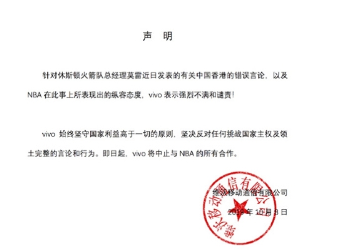 “针对休斯顿火箭队总经理莫雷近日发表的有关中国香港的错误言论,以及NBA在此事上所表现出的纵容态度,vivo表示强烈不满和谴责。vivo始终坚守国家利益高于一切的原则,坚决反对任何挑战国家主权及领土完整的言论和行为。即日起,vivo将中止与NBA的所有合作。 ”vivo在一份公开声明中称。