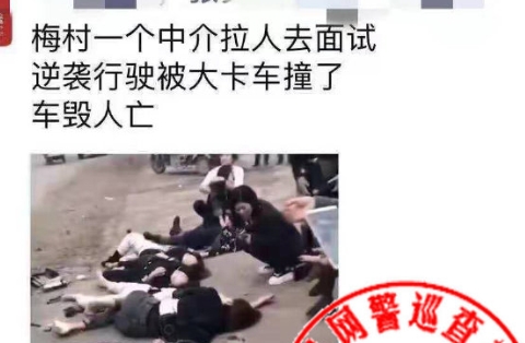“梅村一面试车被大卡车撞”系谣言,传谣者被依法传唤审查。截屏图
