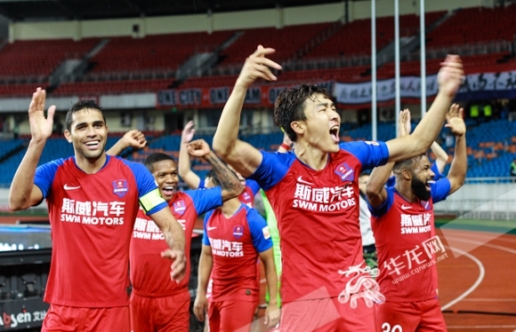 战胜上海绿地申花后,重庆斯威球员们很兴奋。华龙网-新重庆客户端记者 张质 摄