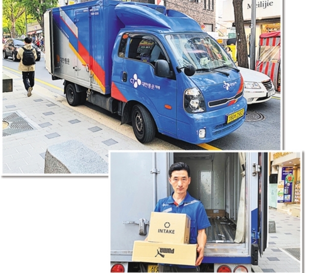 上图 街边正在配送货物的快递车辆。右图 CJ大韩通运快递员展示自己的劳动成果。白云飞摄