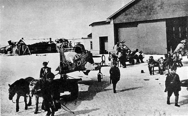 初创时期的东北老航校用马车装运飞机和航材。