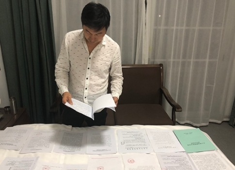 薛锐权在整理申诉材料。澎湃新闻记者 陈绪厚 摄