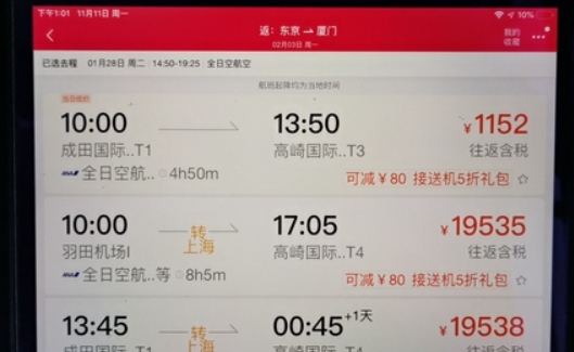 家住厦门的黄女士计划在1月28日到2月3日和朋友一起前往东京旅行,最近一直在关注机票。大概在11月初的时候,黄女士看到飞猪平台宣传的双11特价机票——厦门往返(含税)东京1633元,所以,在双11开始前一个小时,就拿起手机等着抢票。