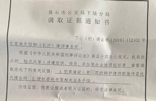 据前述长沙浩天信和律所人士提供的一份盖有黄石市公安局下陆分局公章的调取证据通知书显示,需调取证据材料包括其中一名犯罪嫌疑人黄某萍的辩护律师郭雄伟委托代理合同和授权委托书等相关业务手续。通知书还提示:“伪造证据、隐匿证据或者毁灭证据的,将受法律追究。”