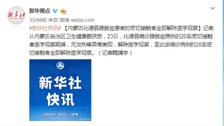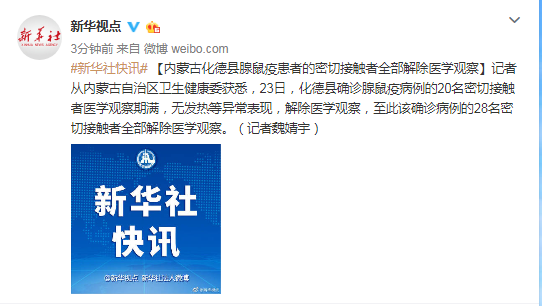 新华社呼和浩特11月23日电(记者魏婧宇)记者从内蒙古自治区卫生健康委获悉,23日,化德县确诊腺鼠疫病例的20名密切接触者医学观察期满,无发热等异常表现,解除医学观察,至此该确诊病例的28名密切接触者全部解除医学观察。