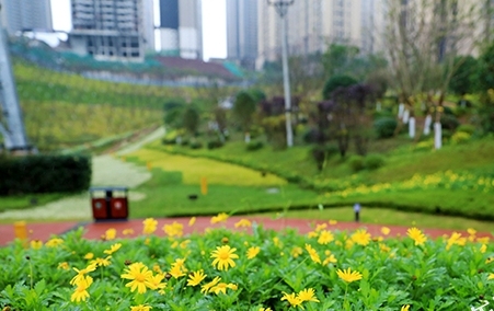 改造后的两江新区金山大道一角,坡地草木苍翠,花朵开得鲜艳无比。华龙网-新重庆客户端记者 谢鹏 摄