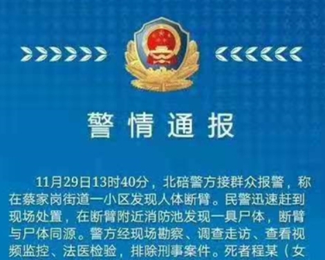 华龙网-新重庆客户端11月30日23时30分讯(记者 张勇)据重庆市公安局北碚区分局消息,11月29日13时40分,北碚警方接群众报警,称在蔡家岗街道一小区发现人体断臂。民警迅速赶到现场处置,在断臂附近消防池发现一具尸体,断臂与尸体同源。