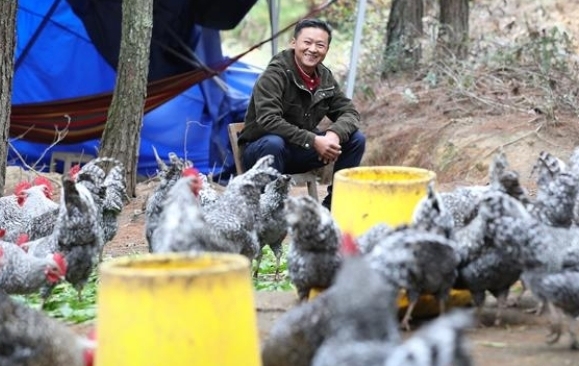 如今,9个月过去了,这批鸡怎么样了?12月4日,从熊勇家出来,步行约200米,步入后山的一片松林中,老远就能听到一阵阵清脆的鸡鸣声,走近一看,数百只精神抖擞、毛色鲜亮的芦花鸡在青山密林之中散养,它们自由啄食、嬉戏。而熊勇在这大自然中与鸡为伍,喂食、打扫鸡舍,心情舒畅,笑得很开心,完全不像一个身患重病之人。