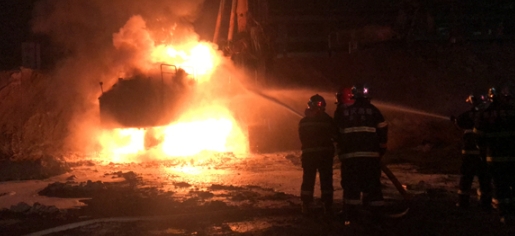 消防指挥员迅速下令出两支泡沫枪堵压火势,并让指战员保证自身安全离,在挖钻机相对较远的位置灭火。