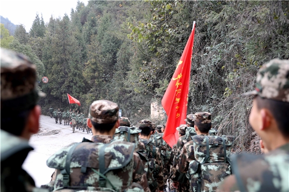 新训拉练途中,新兵们迎着队旗前进。通讯员周宇恒摄