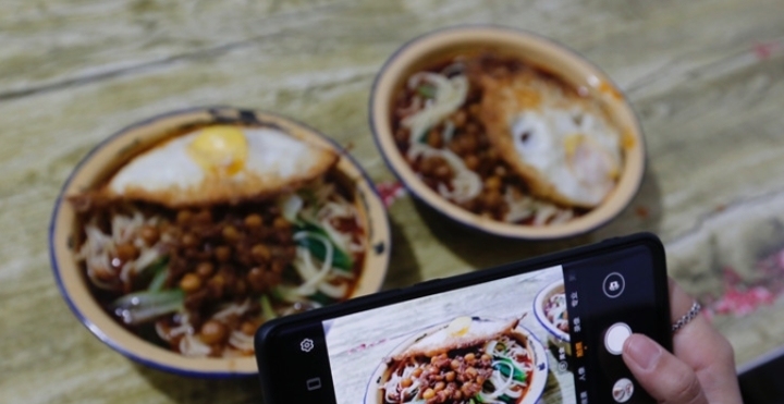 暴露食客身份的是各种自拍杆和手机里一直处于激活状态的相机APP。记者在他们当中随意穿行了两圈就碰到了这样一些情景:黄色的搪瓷面盆端上来先动筷子和转,然后就是掏出手机自拍;有心一点的粉丝还掏出了背包里塑封过的肖战照片摆在面碗旁,一起拍进镜头。