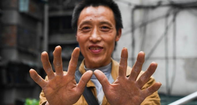 1月5日,冉光辉展示自己的双手。由于长期搬运重物,他的手磨出了不少老茧。新华社记者 王全超 摄