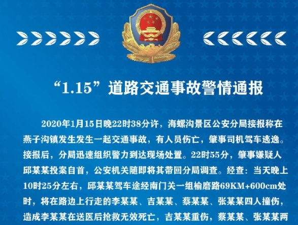 海螺沟景区公安分局通报称,15日22时38分许,海螺沟景区公安分局接报称在燕子沟镇发生一起交通事故,有人员伤亡,肇事司机驾车逃逸。接报后,分局迅速组织警力到达现场处置。22时55分,肇事嫌疑人邱某某投案自首,公安机关随即将其带回分局调查。
