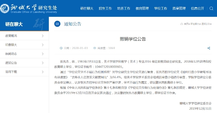 澎湃新闻记者注意到,位于山东的聊城大学研究生处官网1月3日公布了一则《撤销学位公告》:张兆杰,男,1983年7月11日生,美术学院学科教学(美术)专业2016级在职教育硕士研究生。2018年12月获得我校教育硕士学位,学位证书编号:1044732018000601。