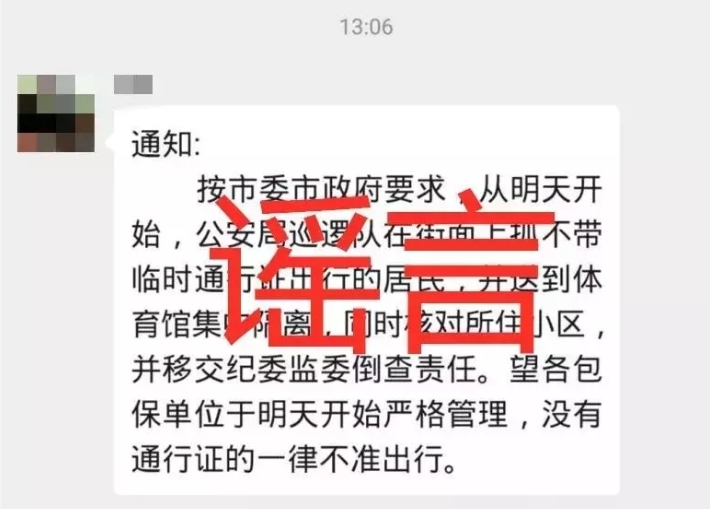 今日,重庆市部分区县的微信群、朋友圈传播一则通知:“按市委市政府要求,从明天开始,公安局巡逻队在街面上抓不带临时通行证出行的居民,并送到体育馆集中隔离,同时核对所住小区,并移交纪委监委倒查责任。望各包保单位于明天开始严格管理,没有通行证的一律不准出行”。