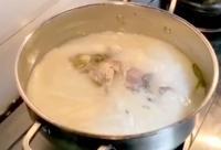 2、依次加入料酒(白酒也行)、姜丝、葱段,用大火加盖煲20分钟,汤色变成奶白时再加入萝卜丝煲10分钟左右,最后加入盐、味精、胡椒粉调味,出锅即成。