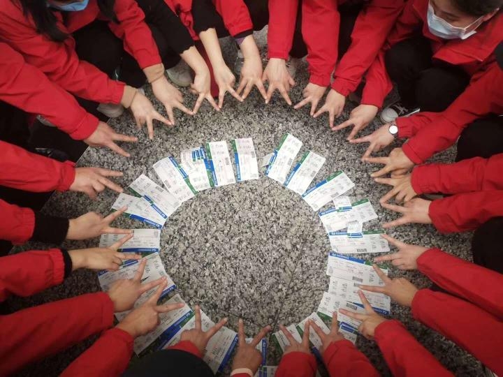 机场工作人员组成多个小队一路喊着“武汉加油”,“白衣战士辛苦”,“一定平安凯旋而归”。