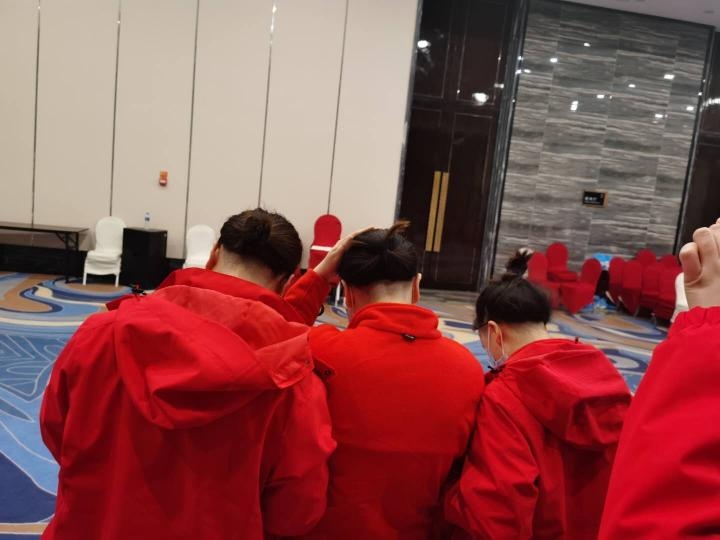 为降低感染风险,头发不能垂落在帽子外,所有的小姐姐们都顾不上美丽的秀发了,断然决定剃掉鬓角和后脑勺头发。由于没有理发店 ,由陈娟老师临时当起了剃头匠 ,剪出来一个个可爱的造型。