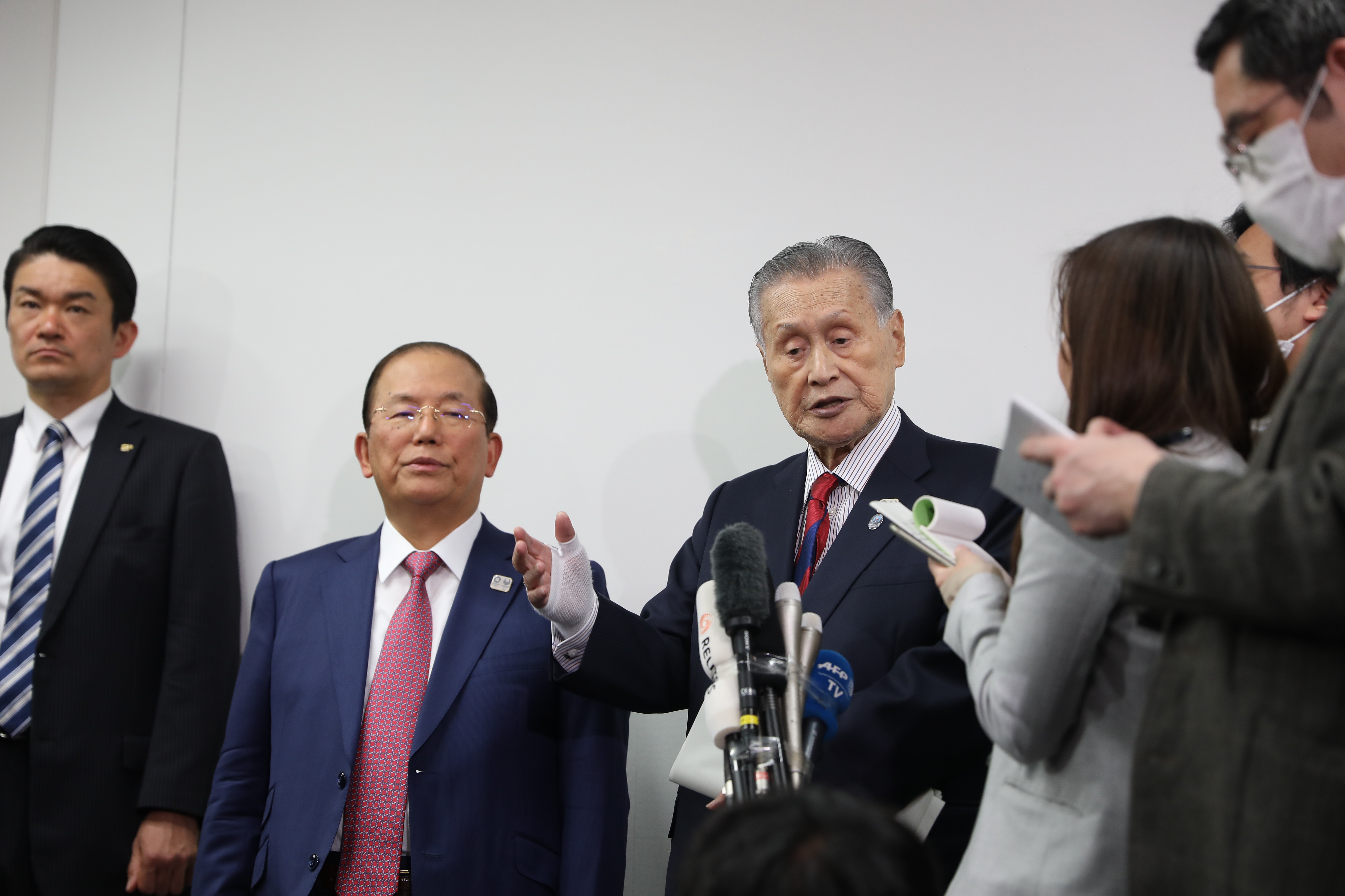 3月4日,东京奥组委主席森喜朗(左三)回答记者提问。新华社记者 杜潇逸 摄