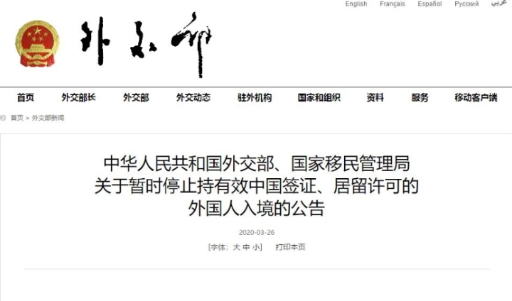 外交部、国家移民管理局发布公告:自2020年3月28日0时起,暂停持有效中国签证、居留许可的外国人入境。
