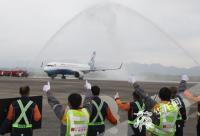 重庆江北机场,载着最后一批重庆支援湖北医疗队员的两架飞机依次通过迎接他们的水门。华龙网新重庆客户端记者 张质 摄