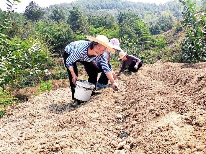 一年之计在于春。几场春雨过后,天气逐渐暖和,正是生姜种植的最佳时节。近日,在长沙镇江庙村生姜种植基地,十多名村民正在栽种生姜。他们用微耕机平整土地、挖坑,播撒底肥,然后下种、盖土,各项工序有条不紊。据了解,全村生姜种植面积150亩。图为江庙村村民在下种。(记者 熊程成 摄)